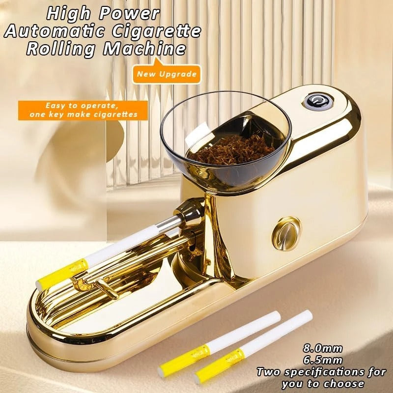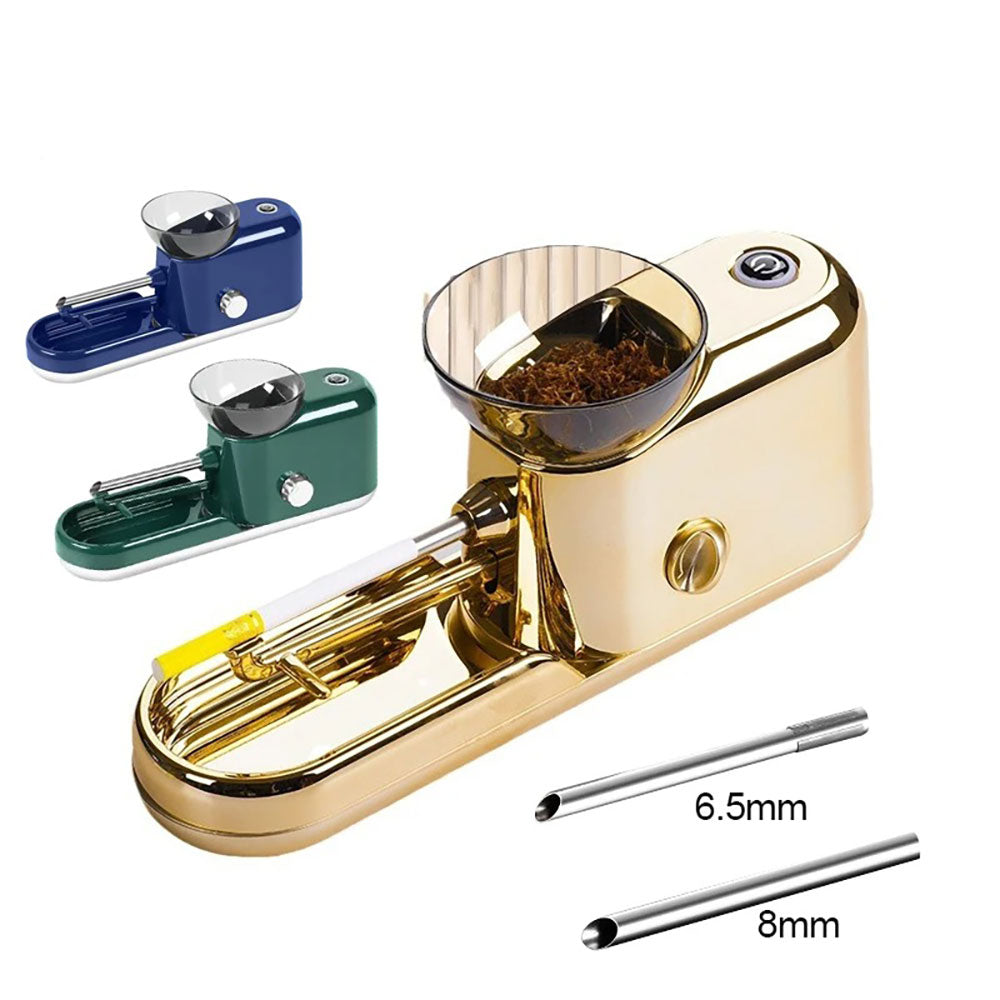 The Rolling Machine is an electric automatic device tailored to roll perfectly filled cigarettes in a fraction of the time required by manual methods. It is equipped with an advanced 380 high-power motor that ensures even and delicate filling every time. Designed for portability and aesthetic appeal, it supports 8.0mm and 6.5mm cigarette sizes and is available in sleek color options like gold, blue, green, and black.
